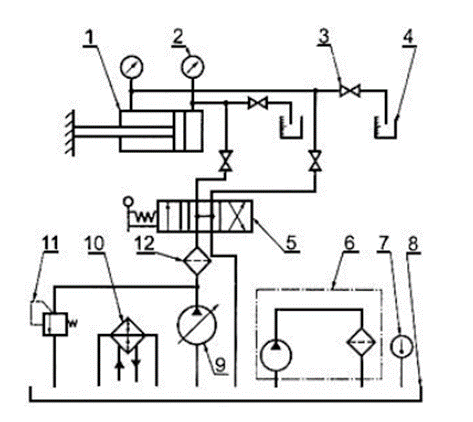 - гидрораспределитель; 6 - фильтрующая установка; 7 - термометр; 8 - гидробак; 9 - насос; 10 - теплообменный аппарат; 11 - предохранительный гидроклапан; 12 – фильтр.