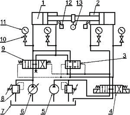 1 - испытуемый гидроцилиндр; 2 - нагрузочный гидроцилиндр; 3 двухпозиционный гидрораспределитель с гидравлическим управлением; 4 - трехпозиционный гидрораспределитель с электромагнитным управлением; 5 - нагрузочный насос; 6 - насос привода; 7 - гидробак; 8 - предохранительный гидроклапан; 9 - трехпозиционный гидрораспределитель с гидравлическим управлением; 10 - кран-демпфер; 11 - манометр; 12 - выключатель; 13 – динамометр.