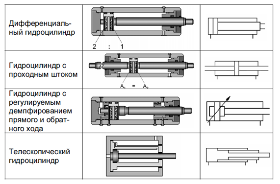 Основные конструктивные схемы цилиндров двустороннего действия и их условные обозначения на гидравлических схемах представлены на рис. 3.