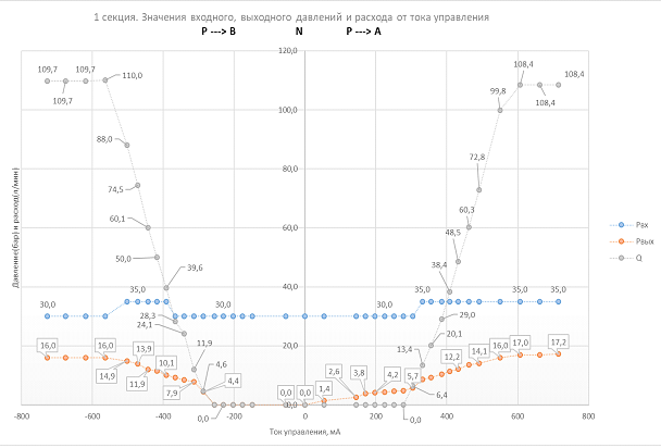 При тестировании секции №1 для портов А и В максимальный расход составил соответственно 108,4 и 109,7 л/мин при токе управления 630 мА.